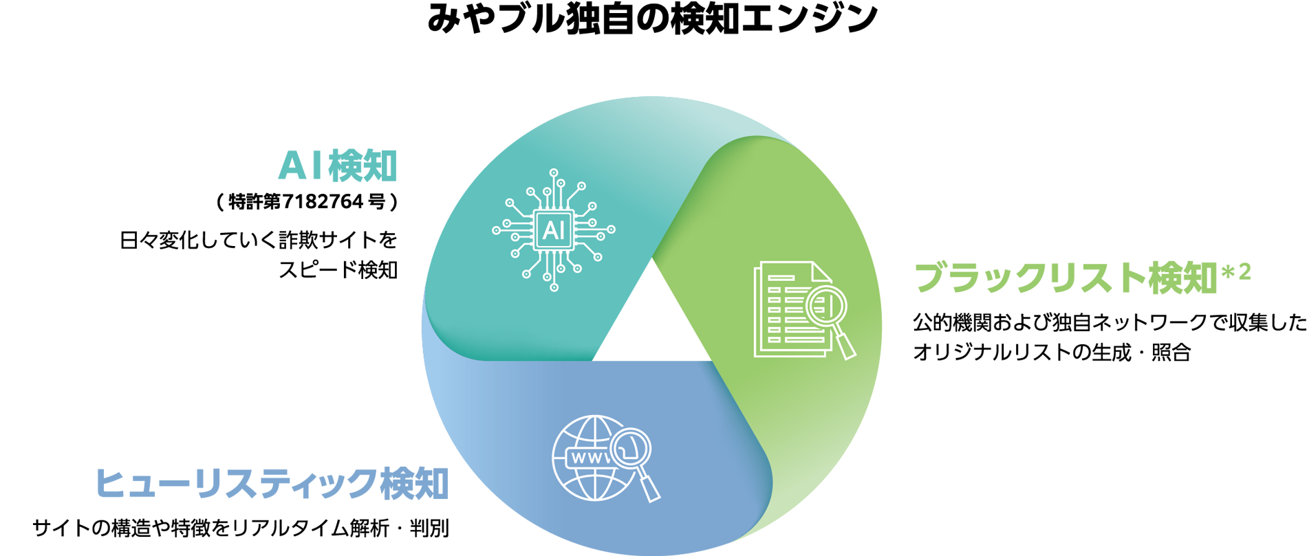 ネット詐欺につながる恐れのあるサイトのURLを登録してブロックする「ブラックリスト検知」のみでは、リストにない詐欺サイトのブロックはできません。みやブルでは「ブラックリスト検知」に加えて、リストにない未知の詐欺サイトもブロックできる「AI検知」と「ヒューリスティック検知」を搭載。3つの検知方法を連携させることで、より素早く詐欺サイトを検知しブロック。さらなる安心を提供します。