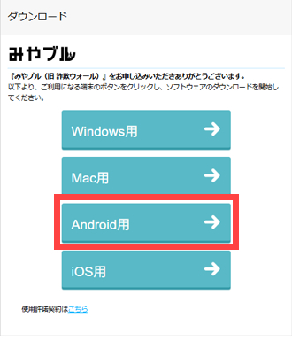 ※商品名「みやブル for マルチデバイス 月額版」の「ダウンロード」ボタンをタップし、[Android用]を選択してください。