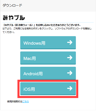 ※商品名「みやブル for マルチデバイス 月額版」の「ダウンロード」ボタンをタップし、[iOS用]を選択してください。