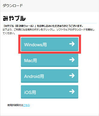 ※商品名「みやブル for マルチデバイス 月額版」の「ダウンロード」ボタンをクリックし、[Windows用]を選択してください。