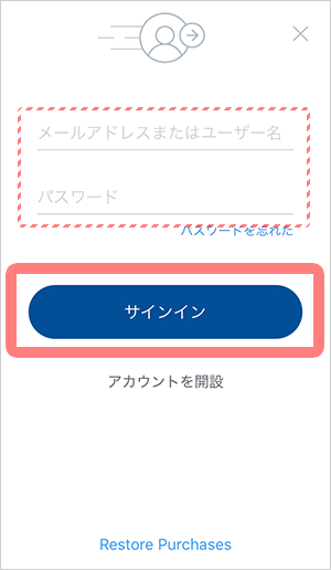 手順2でご登録いただいた[ユーザー名(メールアドレス)]と[パスワード]を入力し、[サインイン]をタップします。