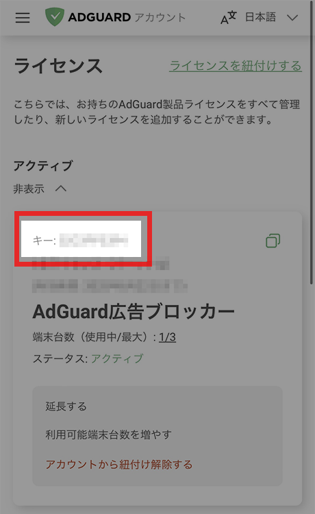 こちらの画面赤枠内に表示されているものが「ライセンスキー」となります。
