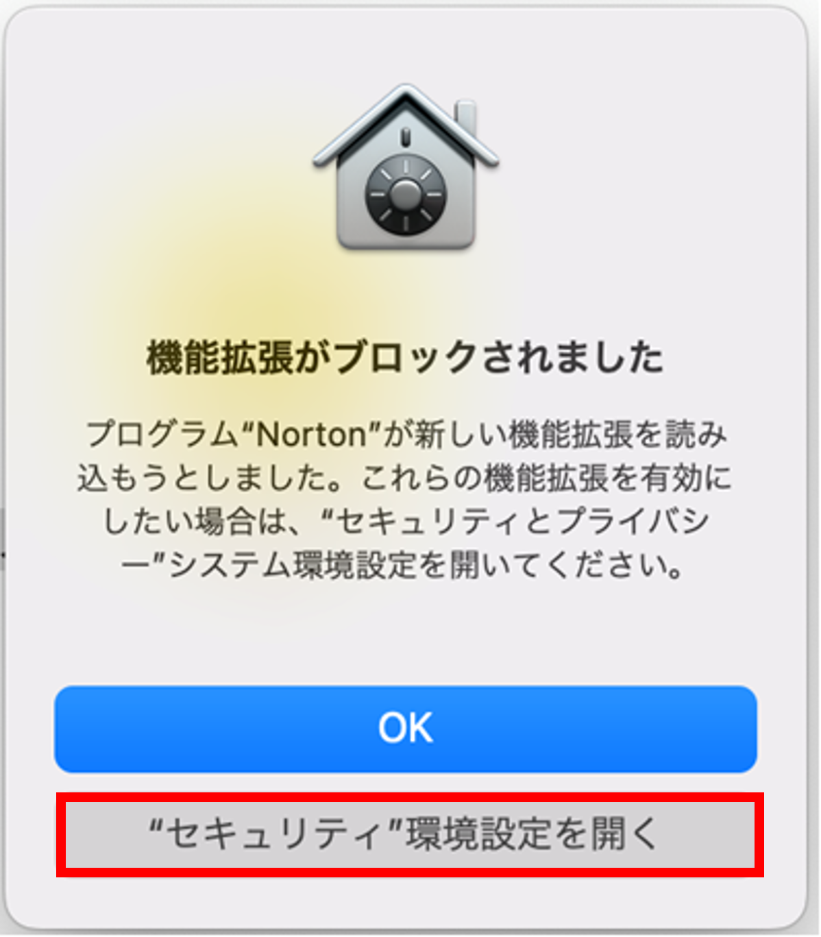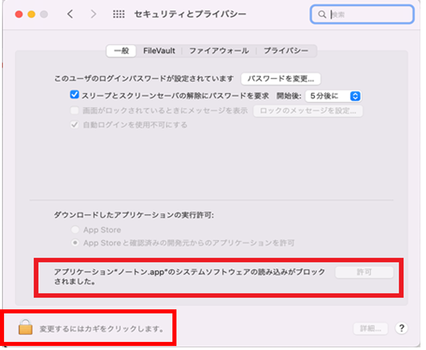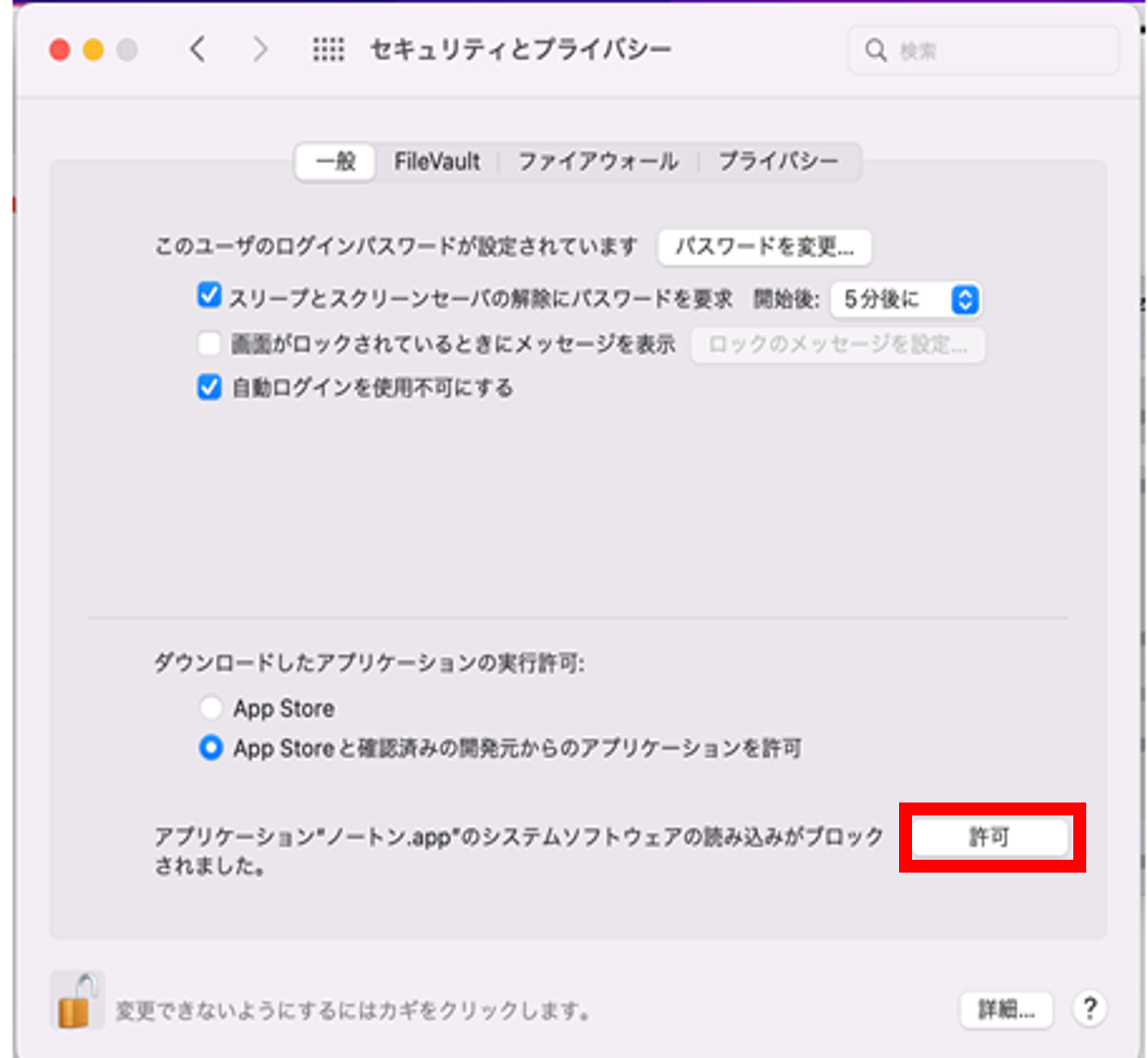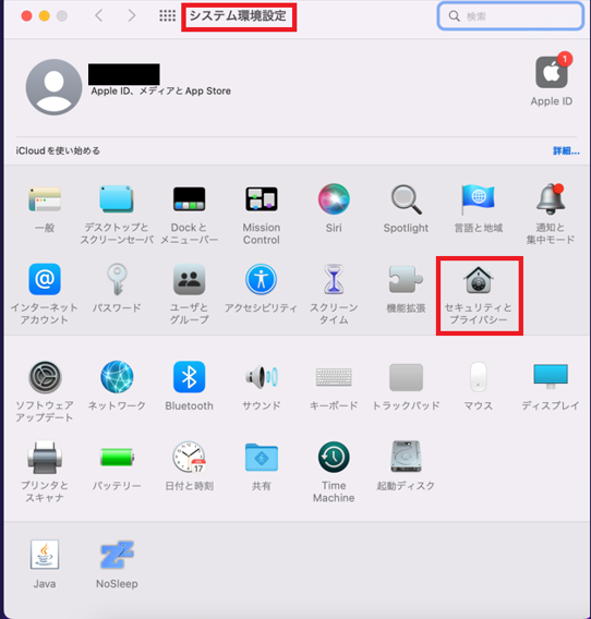 「システム環境設定」の「セキュリティとプライバシー」で一般タブを開きます。[開く]をクリックします。