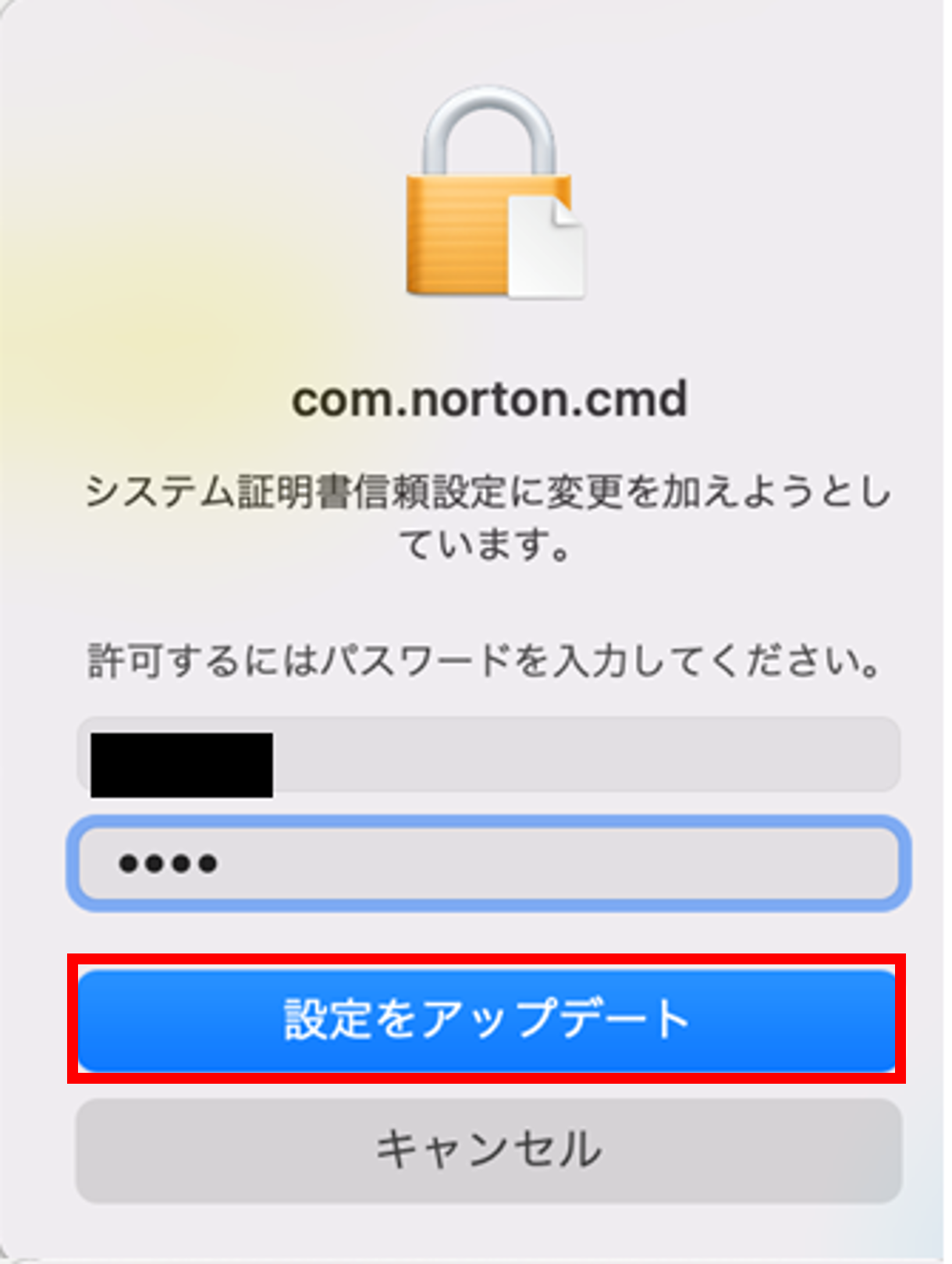 次のようなダイアログが表示されます。Macのユーザー名とパスワードを入力し、[設定をアップデート]をクリックします。