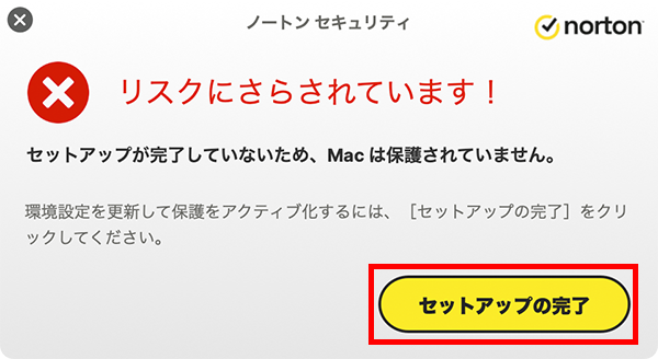 右のダイアログが表示される場合は「セットアップの完了」をクリックします。macが再起動する場合は、画面の指示に従ってください。