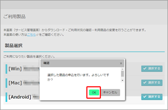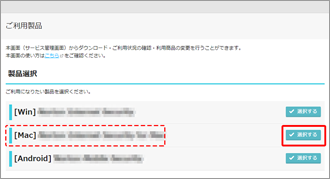 お申し込み後サービスの登録が完了し、[ダウンロード]ボタンをクリックすると、右のような製品選択画面が表示されます。
