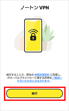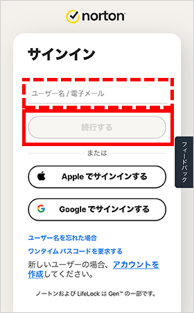 サインイン画面が表示されますので、手順2で登録したノートンアカウントを入力し、[続行する]をタップします。その後、パスワードの入力をして、サインインを行います。