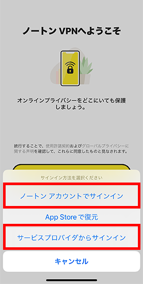 次の画面が表示されます。[ノートン アカウントでサインイン]または[サービスプロバイダからサインイン]をタップします。